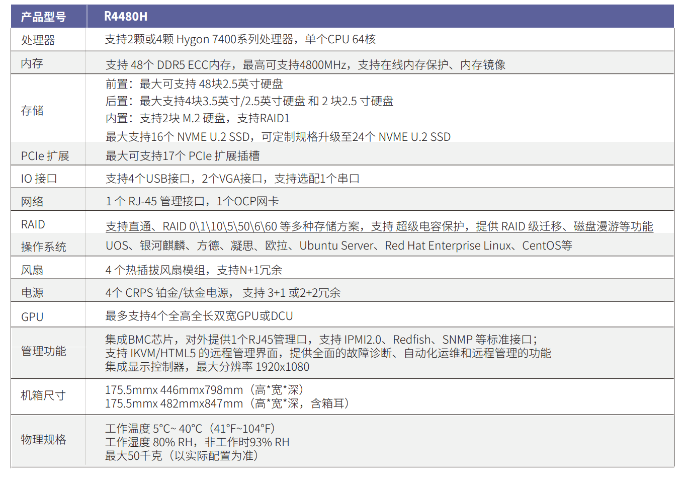 御风服务器R4480H是基于海光7400系列处理器的4U4路机架式服务器,适用于关键业务工作负载,虚拟化、 云计算、数据库等业务,具有计算性能高、存储容量大、扩展性强和可靠性高等特点。